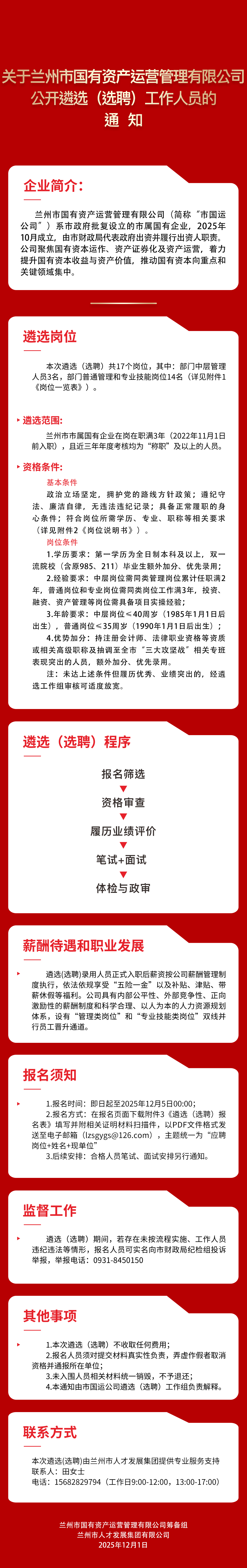 关于兰州市国有资产运营管理有限公司 公开遴选(选聘)工作人员的通知